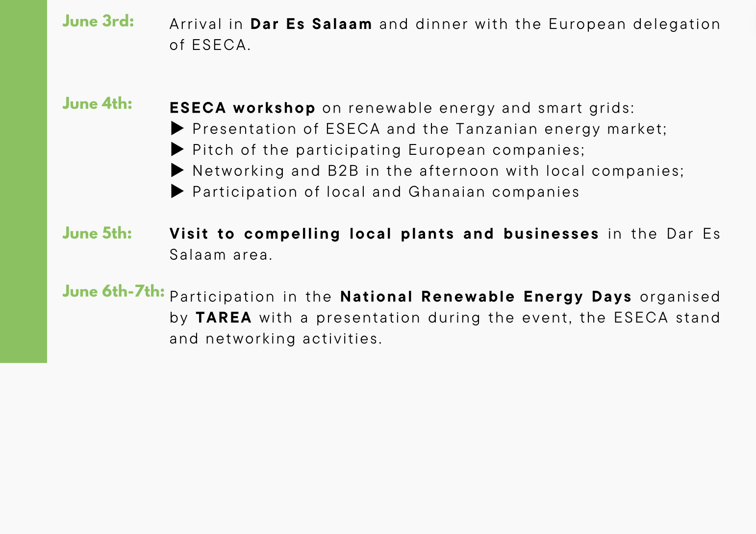 Join the ESECA delegation in the third and final trade mission in Tanzania to meet African and European companies operating in the renewable energy and smart grids sectors.